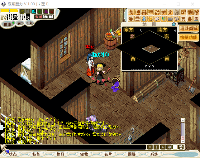 7:走到通往山顶的道路顶楼后,进入传送石,来到山顶,从23.20进入到山顶屋子,与里面的雪女对话,进入战斗(战斗胜利后掉落螳螂改造图)。
